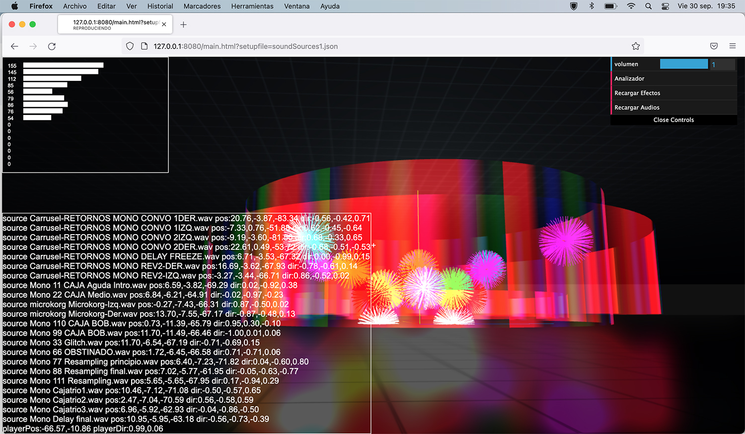 La aplicación utiliza API WebAudio para gestionar las diferentes fuentes de sonido en tiempo real, para posicionar fuentes sonoras en el espacio 3D, simulando un decaimiento del volumen en función de la distancia. Las fuentes se desplazan trazando órbitas y movimientos simples y complejos, aceleraciones y detenimientos.